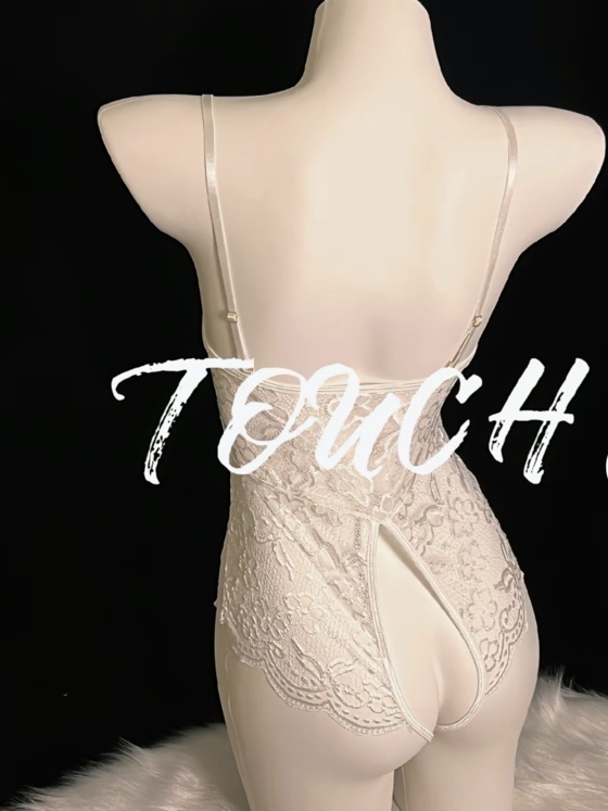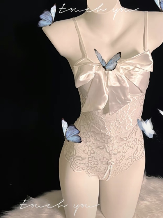 江亦珵松开她,将床头柜上的礼品袋递到她的面前,简约的包装里面是一件白色的性感情趣内衣,大体是透明的蕾丝花纹,胸前是被一个缎带蝴蝶结挡住在没有别的布料,只需要轻轻一扯,就会把整个胸部暴露出来,更不用说花穴和后穴的地方,开叉直接就开到腰,将整个隐私部位都露在外面。
