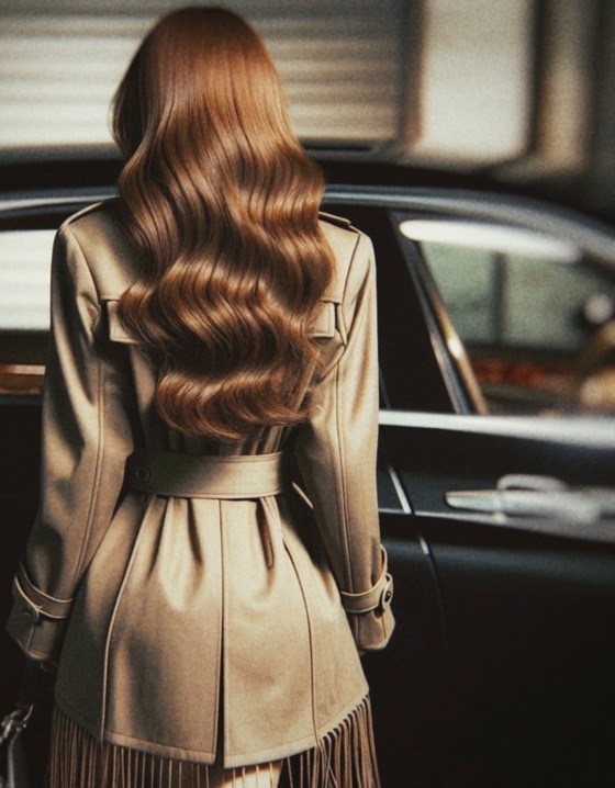 昏暗的路灯下,面前的女孩身着一件修身的米色风衣,宽大的翻领轻抚着她白皙的颈项,腰带紧束,勾勒出她纤细的腰身,下摆一排排流苏如同秋日稻田中熟透了的麦穗,随着微风轻盈地舞动。
