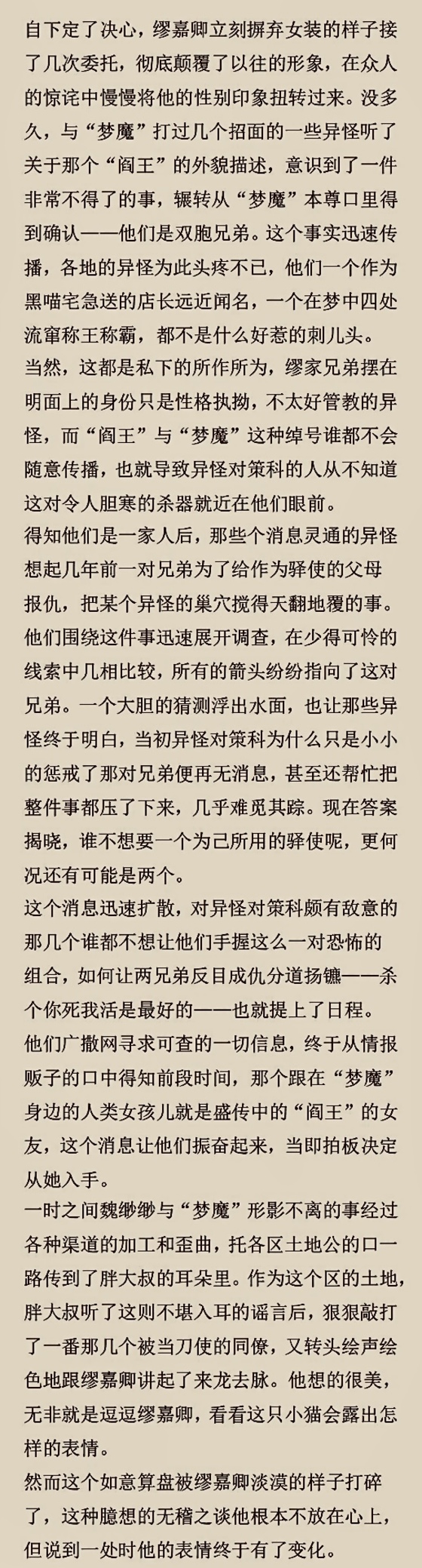以防正文没解释清楚,在这里再说一下,异怪对策科知道两兄弟是驿使,但不知道他们是“阎王”和“梦魔”,也不会有异怪提醒他们,异怪与这些人最多只是合作关系,不会更进一步接触,双方都留有底牌以防背刺。